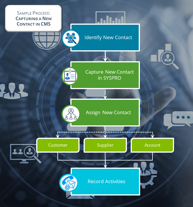 SYSPRO's Contact Management System enables you to store and query information about the people you interact with in the business environment. It assists you in tracking communications, appointments, activities, etc., between the touchpoints of an organization.