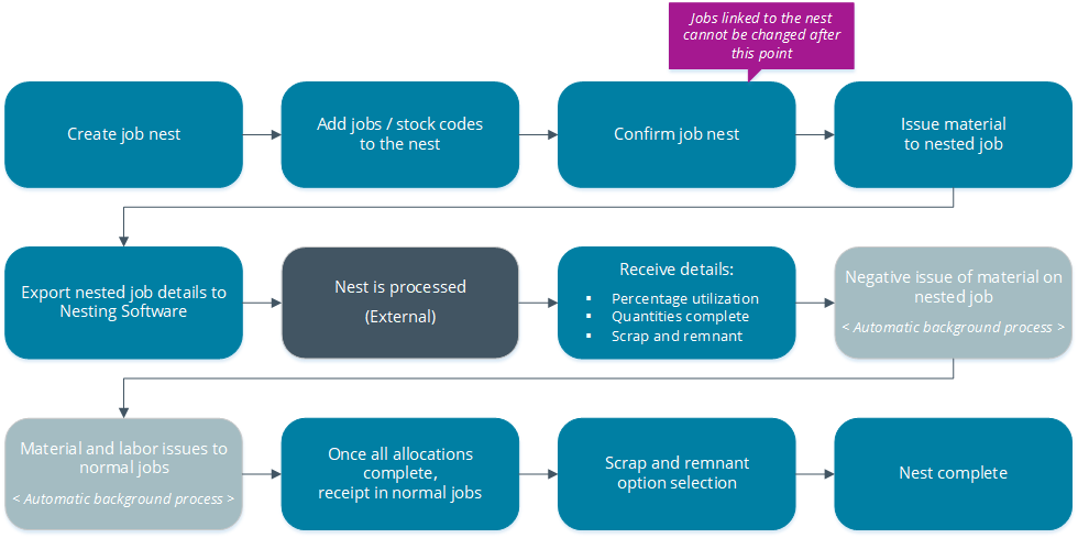 The Job Nesting feature lets you combine several small jobs into one larger nested job process. This lets you view and select combinations of work orders that can be batched together into larger processes (e.g. you can nest multiple jobs using the same raw material or components).