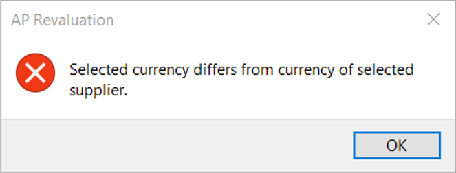 If there are currencies where a relevant exchange rate cannot be found, these errors will be displayed in the AP Revaluation Report pane. The transactions for these currencies will not be revalued. However, currencies with valid exchange rates will still be processed.