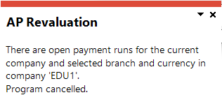 This message is displayed when you access the AP Exchange Rate Revaluation program while open payment runs exist in the database.