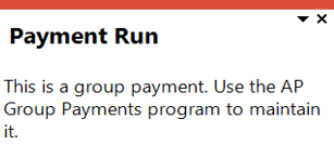 If all suppliers included in a payment run belong to the primary company, then the payment run is referred to as a group payment run. If one or more of the suppliers belong to another company, i.e. not the primary company, then the payment run is regarded as an intercompany group payment run. You create and maintain group payment runs to process payments to your supplier groups using the AP Group Payments program.