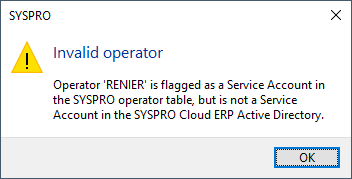 This message is displayed if you enter an operator that is configured as a Service Account in the Operator Maintenance program, but which is not yet configured correctly with the Syspro Cloud ERP Active Directory.
