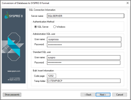 For security reasons, if default values exist in either password field on the SQL Connection Information screen of the Data Conversion wizard, selecting the Show passwords button will remove the password mask as well as the actual password.