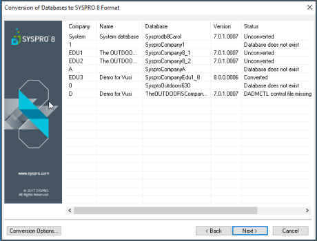 The Data Conversion program is a wizard that guides you through the process of converting your data from Syspro 7 Update 1 to Syspro 8.