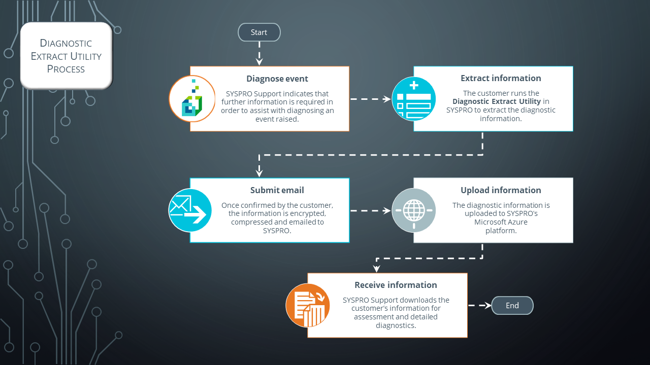 The extracted information is encrypted and compressed before being emailed to SYSPRO for analysis and troubleshooting by the relevant support team.