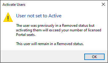 This message is displayed if you attempt to activate a portal user when you have already consumed all the portal seats available in your license.