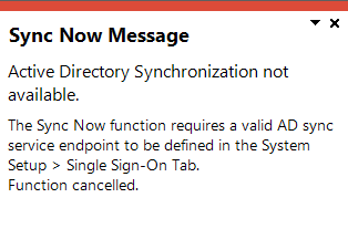 This message is displayed when you select the Sync Now function of the Active Directory User Management program and the endpoint for the Syspro 8 Active Directory Sync Service is not configured correctly.