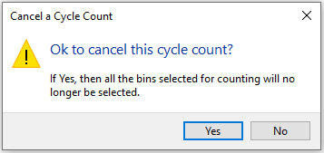 Select Yes to cancel the cycle count or select No to return to the Cycle Counts window without canceling the cycle count.
