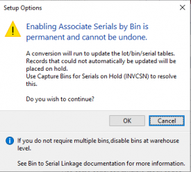 This message is displayed when the Associate serials by bin setup option is enabled for the first time (Setup Options > Configuration > Distribution > Inventory).