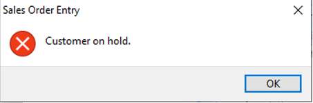 This message is displayed when you have attempted to create a new sales order or maintain existing sales order lines against a customer who has been placed on hold.