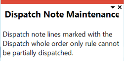 If you allow operators to add lines to existing dispatch notes, then the Manual release to invoice Manual release to invoice setup option must be enabled (Setup Options > Configuration > Distribution > Dispatch Notes).