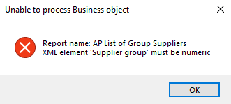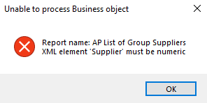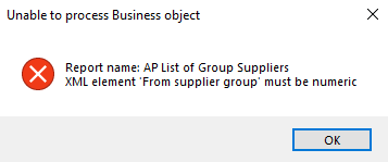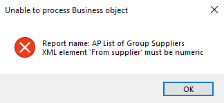 Indicate the sequence according to which you want to generate your report of supplier groups: This generates the report according to the primary suppliers associated with each supplier group in numeric order. Primary suppliers associated with a supplier group are indicated in the Primary supplier field of the AP Group Suppliers program. This option isn't currently applicable as you can only create supplier groups and group payments within a single company. This generates the report according to the primary suppliers associated with each supplier group first in a numeric order, then according to the currencies associated with a secondary supplier in an alphabetical order. For example: Secondary suppliers with a currency code of $ are grouped together and displayed before those with a currency of EUR and then GBP. The currency associated with a secondary supplier is indicated against the Currency field in the Secondary Supplier listview of the AP Group Suppliers program. |