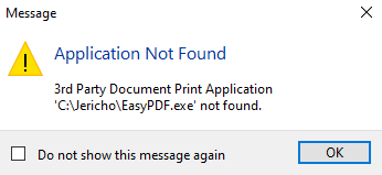 This message is displayed when you select a Printer and haven't indicated the correct location associated with the executable for the third-party application.