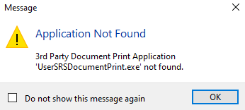 This message is displayed when you select a Printer and haven't indicated the Application name of the executable file associated with a third-party application that you want to use when printing a document or report.