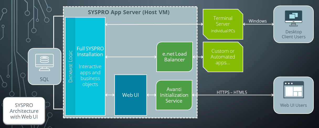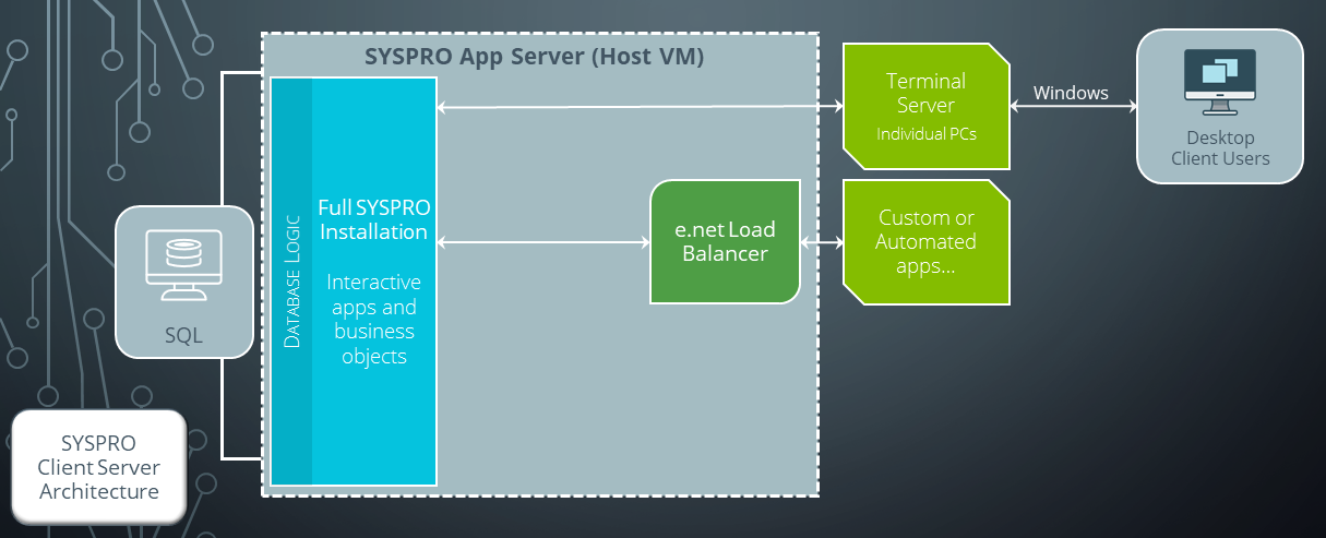 The Desktop Client Users connect via Terminal Server (or Individual Windows PCs) via the Syspro 8 Communications Service (not included in the diagram) to the interactive apps on the SYSPRO app server.