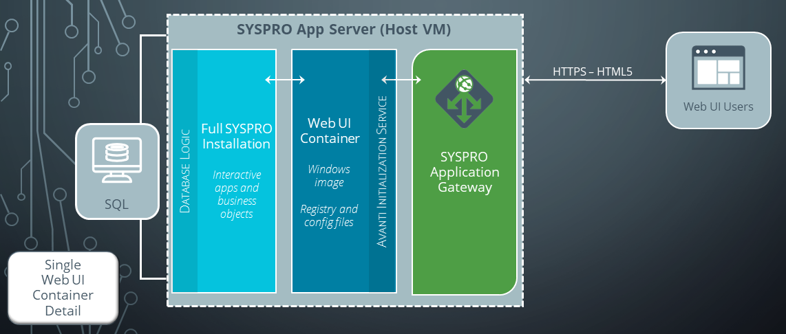 The Syspro 8 Avanti Initialization Service (running inside each container) loads an instance of the Web UI component (as normal) which in turn communicates with the interactive app.
