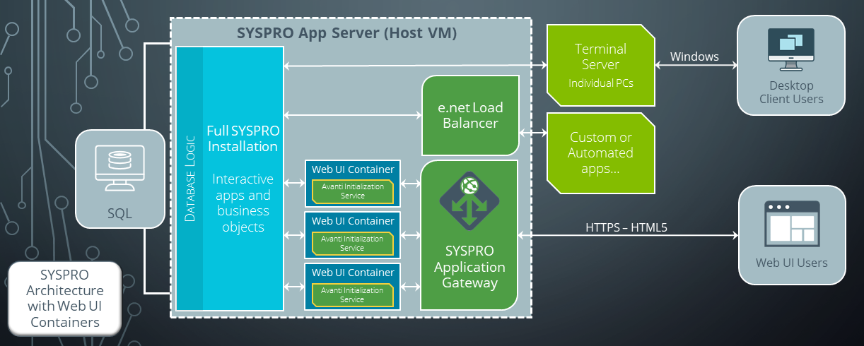 When users interact with the SYSPRO Web UI (using Windows containers) the network traffic is routed via the Syspro Application Gateway Service.