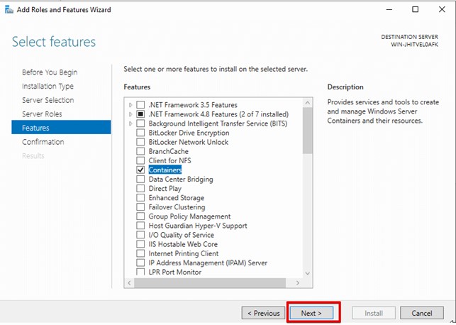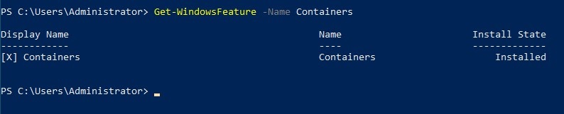 Confirm that the containers' features are installed by executing the following command in Windows PowerShell: