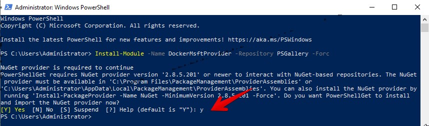 Complete the installation of the NuGet provider package by pressing Y from the keyboard: