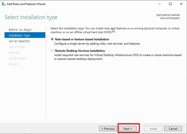 From the Select installation type screen, select the Role-based or feature-based installation option: