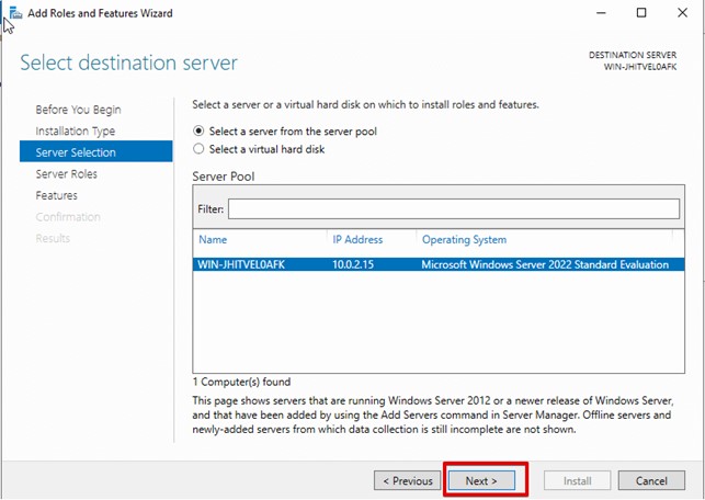 From the Select destination server screen, enable the Select a server from the server pool option and ensure that the default server (i.e. Microsoft Windows Server 2022 Standard Evaluation) is selected: