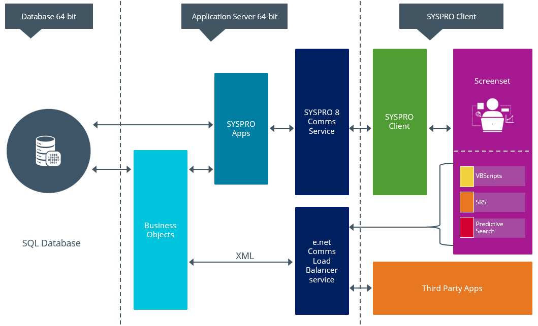 Specific client components (e.g. VBScript, SRS, Predictive search, etc.) use the Syspro 8 e.NET Communications Load Balancer service to call the relevant business objects.