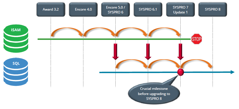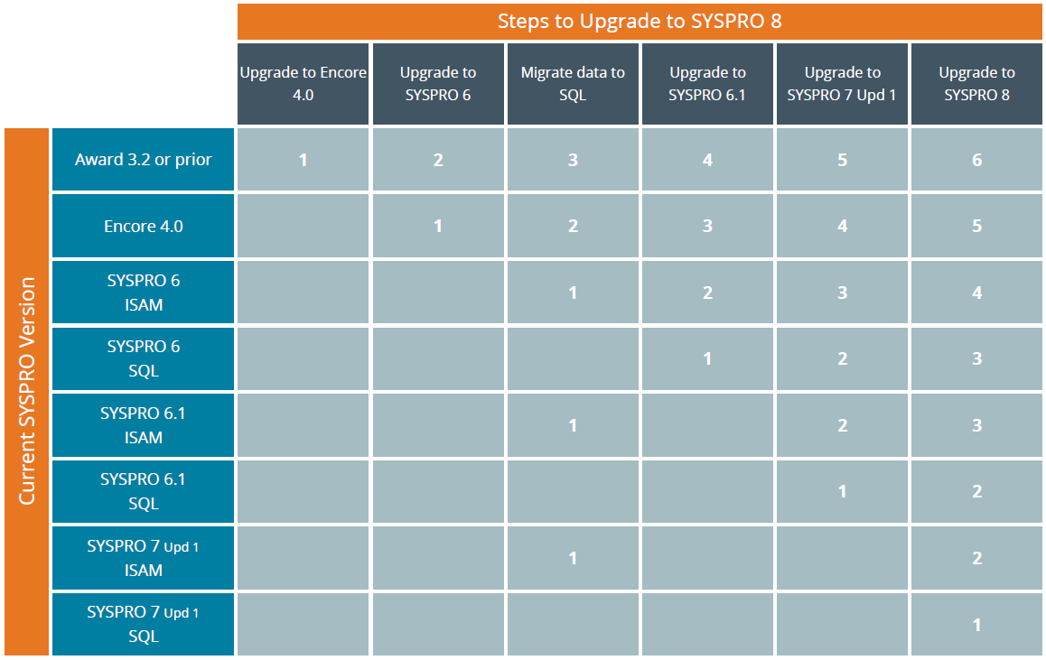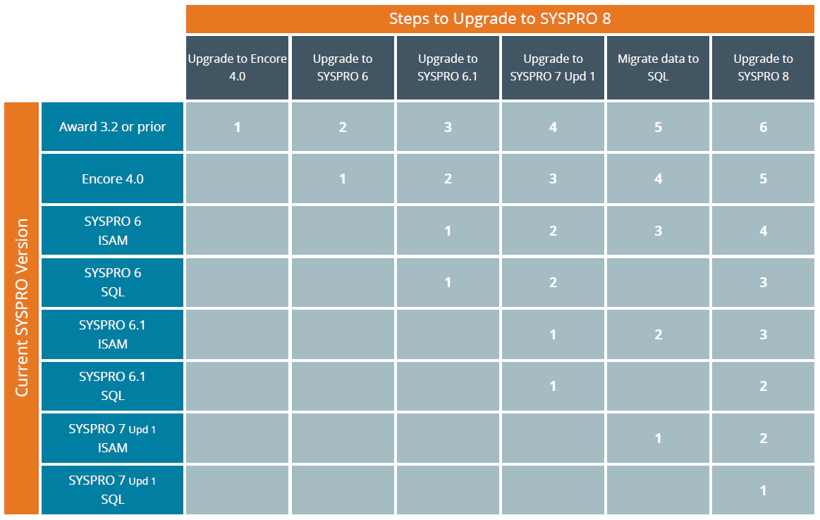 - Upgrade to Syspro 7 Update 1 (ISAM) > Migrate to Syspro 7 Update 1 (SQL) > Upgrade to Syspro 8.