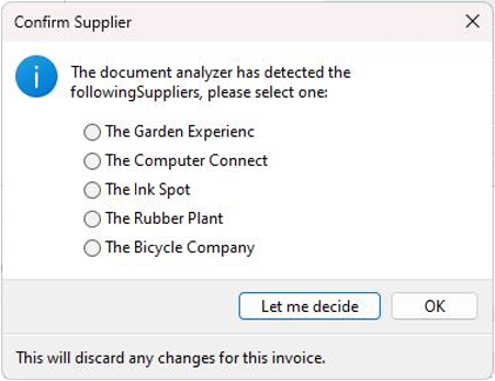 This message is displayed once you have uploaded a document at the Document Analyzer pane within the AP Invoice Posting program and the system detected multiple possible suppliers.