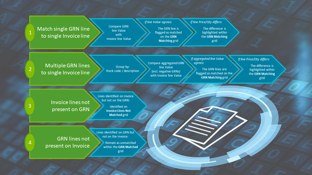 Efficient extraction and validation against SYSPRO data, including matching of the purchase order number and invoice detail lines to GRNs (goods received notes)