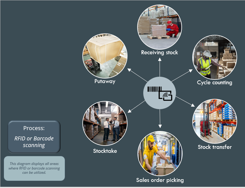 Processes such as sales order picking, inventory putaway, cycle counts, etc., are greatly simplified with barcode and RFID scanning.