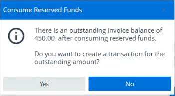 The Consume Reserved Funds informational message was displayed where you have selected Yes to create a transaction for the outstanding amount, i.e. re-reserving the remaining funds for the outstanding quantity.