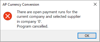 This error message is displayed when there are incomplete payment runs in another company for the supplier selected in the AP Currency Conversion program.