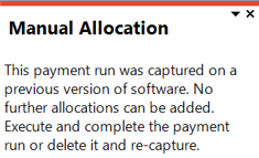 This error message is displayed when you attempt to manually add allocations to a group payment run that was created using a software version prior to Syspro 8 2022.