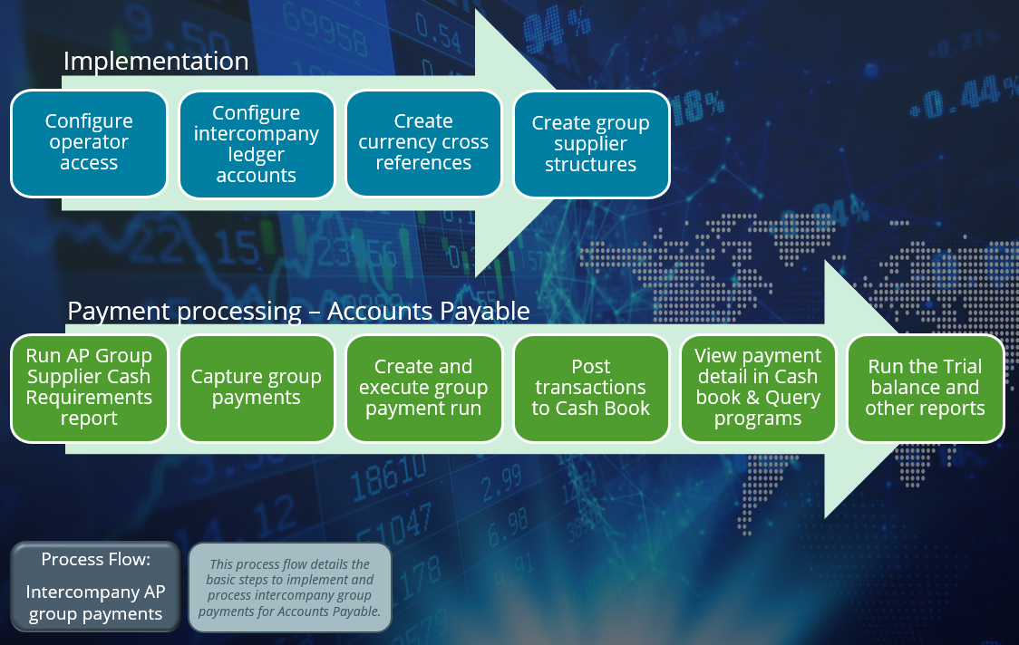 An intercompany group payment affects two or more SYSPRO companies and involves the Accounts Payable and Accounts Receivable modules.