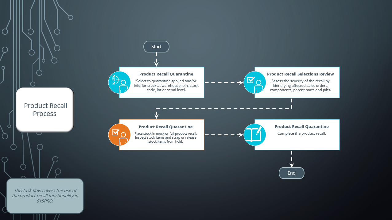 SYSPRO's Lot Traceability system is used to identify all items and transactions involved in the recall. Items are placed into quarantine for inspection.
