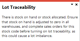 You won't be able to save your changes if there is stock on hand for the selected stock code or if the stock code was allocated to a sales order that has not been completed.