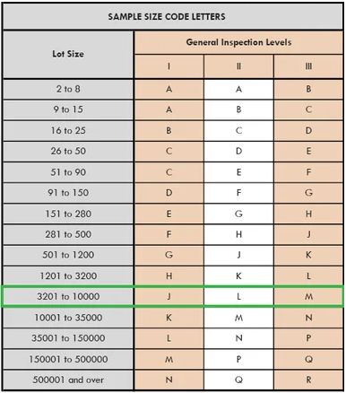 A lot size of 5,000 would fall within the range of 3201 - 10000, which in turn means that the inspection level for GI indicates J, for GII it would be L and for GIII M would apply.