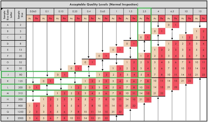 The diagram below depicts the accept (Ac) and reject (Re) levels based on the various AQL levels: