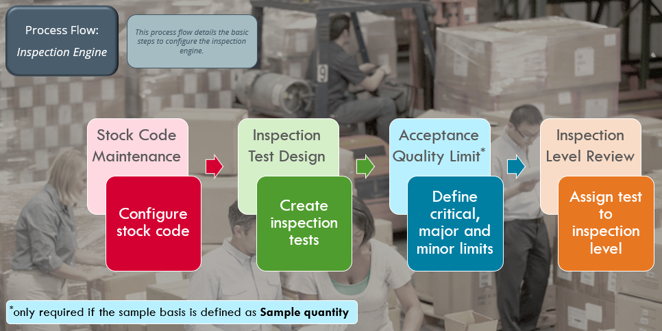 The test engine is used to design inspection tests with acceptance quality levels, to capture inspection data and ultimately pass or fail the inspection. The inspection data helps businesses identify potential risks in the product, set tolerances against these risks, and ultimately accept or reject a product batch based on given criteria.
