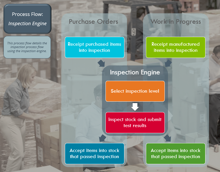 The configurable Inspection Engine feature assists you in creating an inspection system that adheres to the standards laid out by the International Organization of Standardization (ISO). It consists of a test engine and a dashboard that give you the opportunity to greatly improve internal controls over the manufacturing process and the quality inspection procedure of work in progress (WIP) and purchase order receipts.