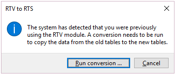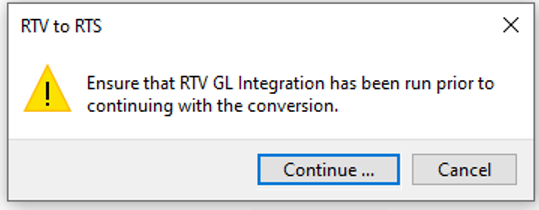 When the second message is displayed, select Continue to copy the journals from the legacy RTV tables to the latest RTS tables.