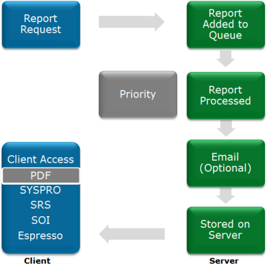 When a report is requested from a client workstation, the request is added to a report queue (much like sending a document to a printer).
