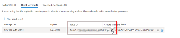 Once completed, you are returned to the Certificates & secrets screen, from where you can retrieve the client secret.